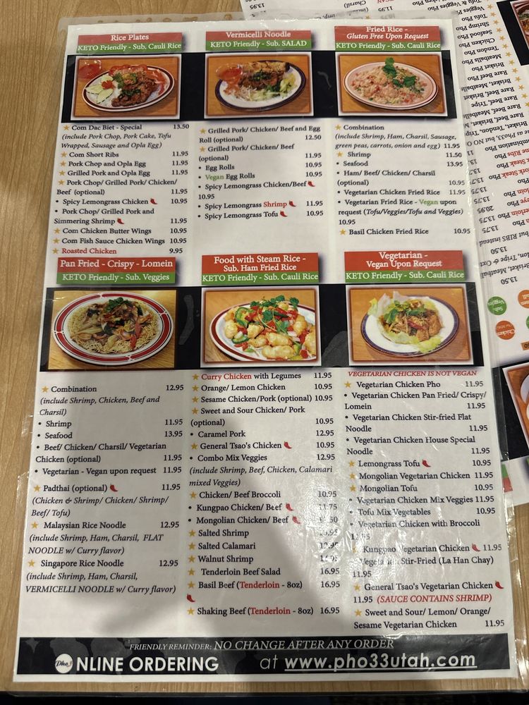 Located in South Salt Lake, UT, Pho 33 is a Vietnamese restaurant specializing in soup and noodles. The menu features vegan options, limited vegetarian choices, and a variety of dishes with a focus on pho and bun. Customers praise the flavorful broth and generous portions, with many recommending the ox tail or BBQ ribs pho. The restaurant offers takeout, delivery, and catering services, making it a convenient choice for diners. Despite some mixed reviews on service speed and attention to detail, Pho 33 stands out for its authentic flavors and affordable prices. With a casual ambiance and a good selection of dishes, Pho 33 is a go-to spot for those craving delicious Vietnamese cuisine.